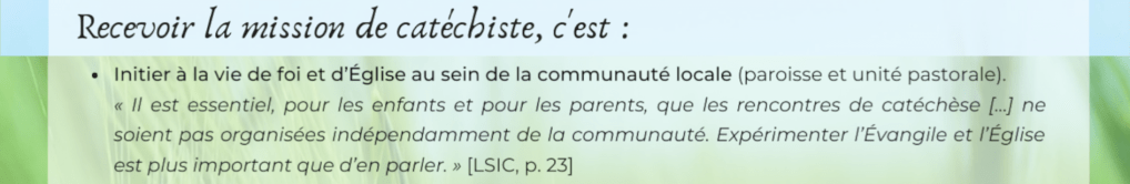 Bienvenue dans le huitième module de la formation sur les « Repères pour la mission des catéchistes » qui parle de la tâche du catéchiste d’initier à la vie en Église. Vous êtes invité à suivre le module selon les points de déroulement ci-dessous. Équipez-vous d’un carnet pour pouvoir noter le fruit des différents exercices. La durée du module est estimée à 20 minutes. Pour toute question n’hésitez pas à contacter vos responsables de pôle catéchèse ou le Service de la catéchèse du Bw. Bonne formation !