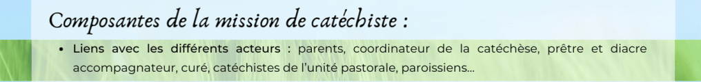 Bienvenue dans le seizième module de la formation sur les « Repères pour la mission des catéchistes » qui traite de deux aspects de la mission du catéchiste liés entre eux : celui d’être en lien avec les différents acteurs impliqués dans la catéchèse en paroisse et celui de participer à la vie de l’Église locale. Vous êtes invité à suivre le module selon les points de déroulement ci-dessous. Équipez-vous d’un carnet pour pouvoir noter le fruit des différents exercices. La durée du module est estimée à 30 minutes. Pour toute question n’hésitez pas à contacter vos responsables de pôle catéchèse ou le Service de la catéchèse du Bw. Bonne formation !