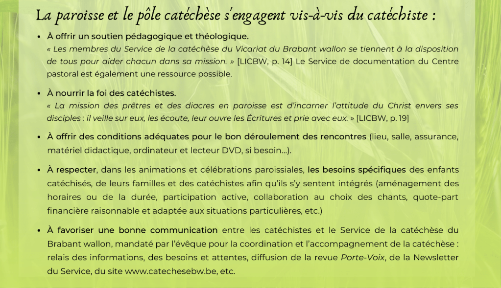 Bienvenue dans le dix-septième module de la formation sur les « Repères pour la mission des catéchistes » qui traite des engagements que prennent la paroisse et le pôle catéchèse de l’UP vis-à-vis du catéchiste. Vous êtes invité à suivre le module selon les points de déroulement ci-dessous. Équipez-vous d’un carnet pour pouvoir noter le fruit des différents exercices. La durée du module est estimée à 30 minutes. Pour toute question n’hésitez pas à contacter vos responsables de pôle catéchèse ou le Service de la catéchèse du Bw. Bonne formation !