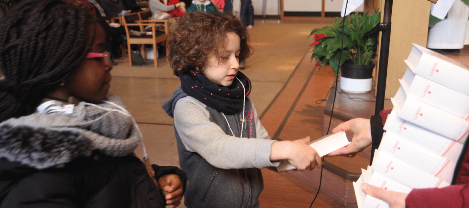 Dieu, qui nous aime, à travers les siècles de l’histoire humaine, a désiré se rendre proche de l’homme et lui parler. Il a inspiré ses fidèles à mettre par écrit son message d’amour : c’est la Bible. Pour pouvoir continuer à découvrir Dieu, les enfants reçoivent ce trésor de l’Église : le prêtre leur remet le livre des Évangiles ou une Bible entière. Ils se mettent ainsi à l’écoute de ce Dieu qui leur parle. Les Écritures seront le fondement et le point de repère de tout leur cheminement en catéchèse.
