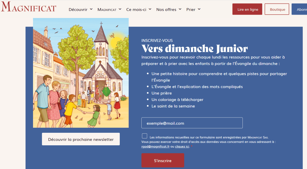 Notamment vous pouvez vous inscrire gratuitement à la Newsletter de « Magnificat Junior » et ainsi recevoir chaque lundi l’explication de l’évangile du dimanche suivant incluant une petite prière et un dessin à colorier